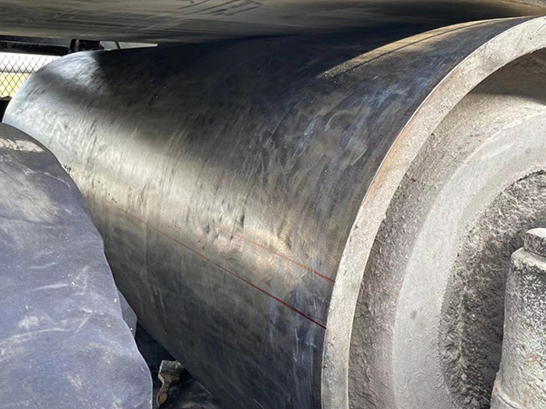 6、筒體清潔:將現(xiàn)場(chǎng)在裝滾筒或更換下來(lái)的滾筒兩端用支架支起,懸空,以便于加工操作,使用鏟膠機(jī),祛除滾筒表面的殘膠,將金屬表面打磨平滑。如果有條件可用車床加工,以增強(qiáng)工作效率。